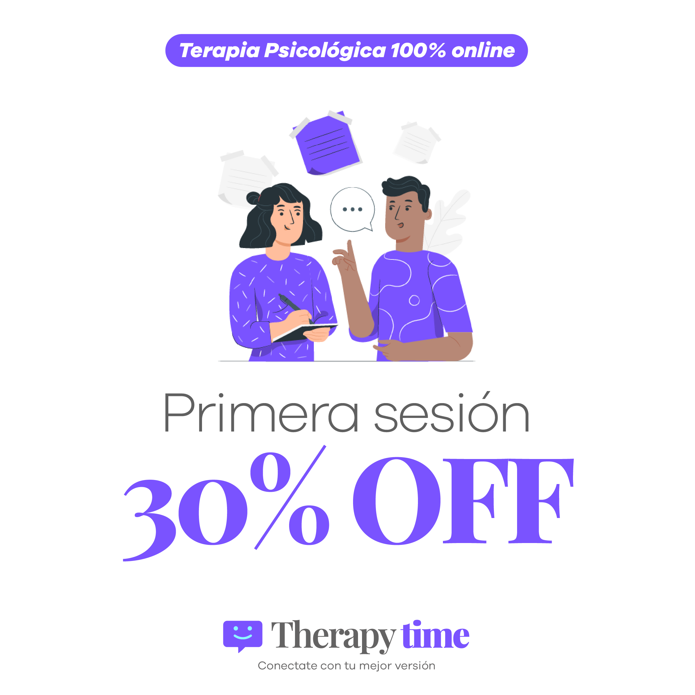 Dar el primer paso hacia el cuidado de tu salud mental puede ser difícil. En Therapy Time, te entendemos y queremos acompañarte en este proceso. Por eso, queremos invitarte a experimentar los beneficios de nuestra plataforma con un encuentro con un 30% de descuento con un profesional del equipo.